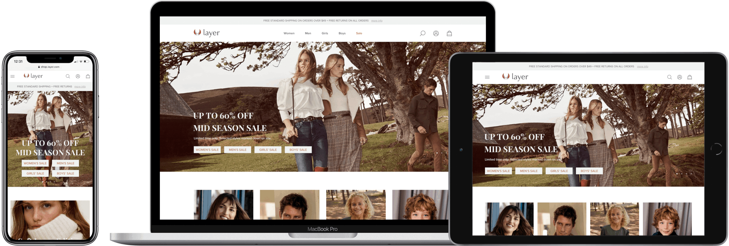 The Layer responsive website assists users in choosing desired size and styles; Creates a natural comparing process for users; and highlights essential information such as product details, discount, and shipping/returns policy.